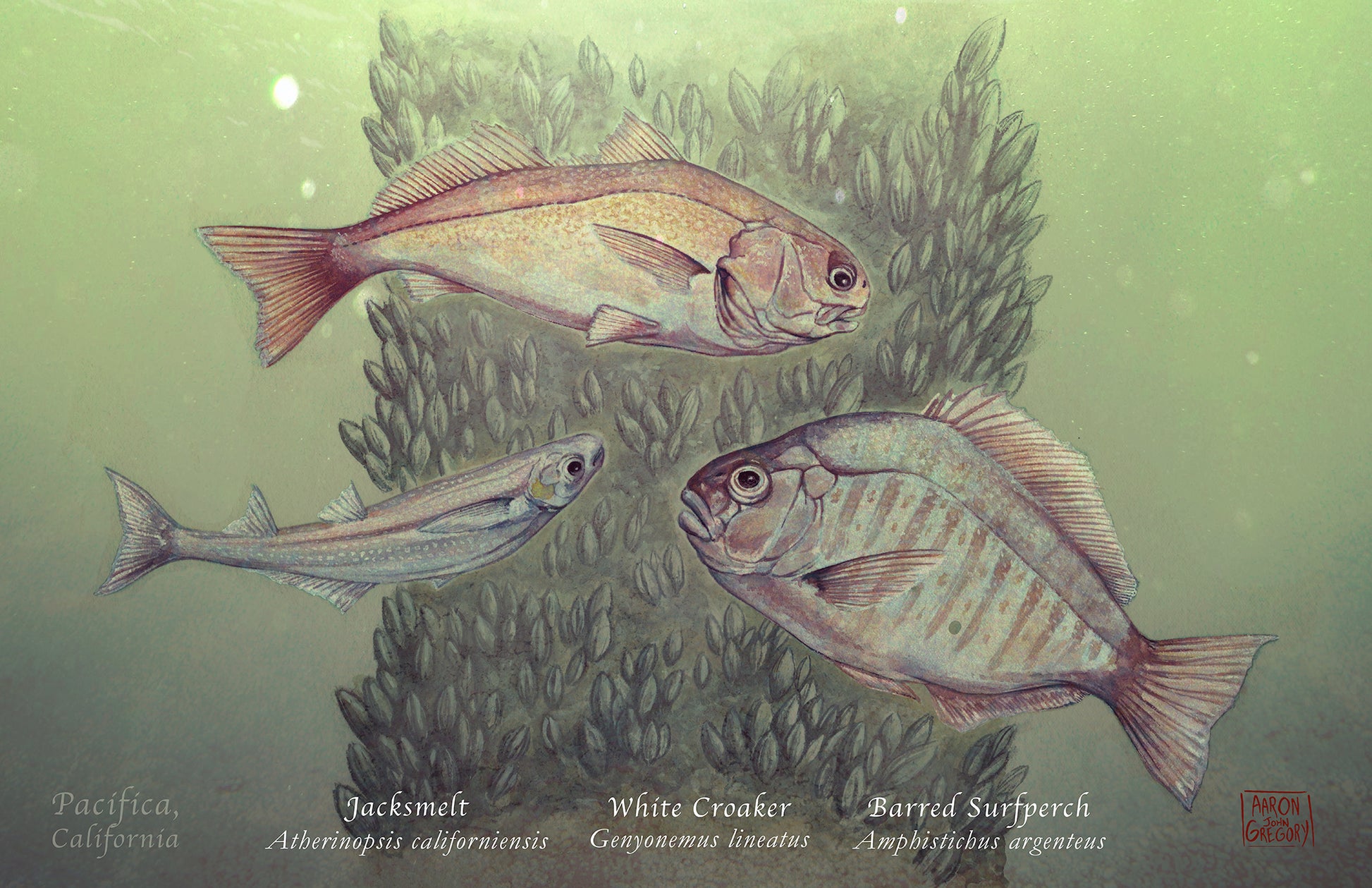 Beautiful water color painting of three common species of pier fish found at the Pacifica Pier.