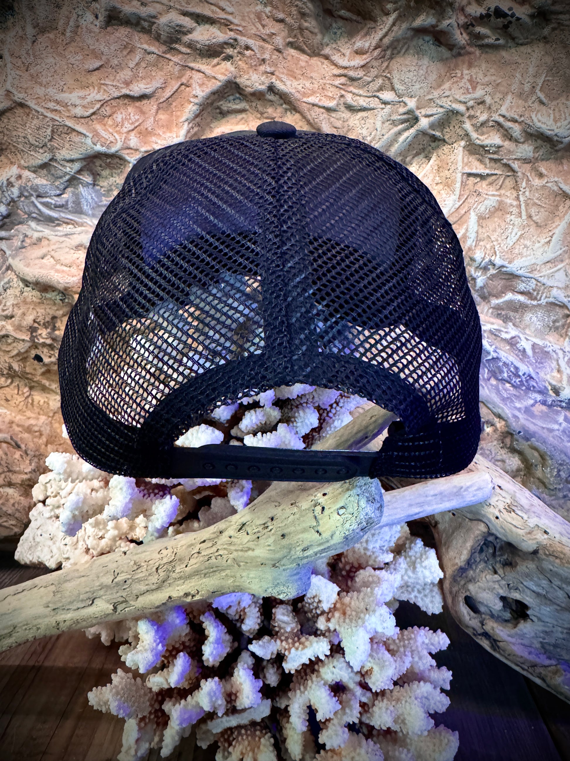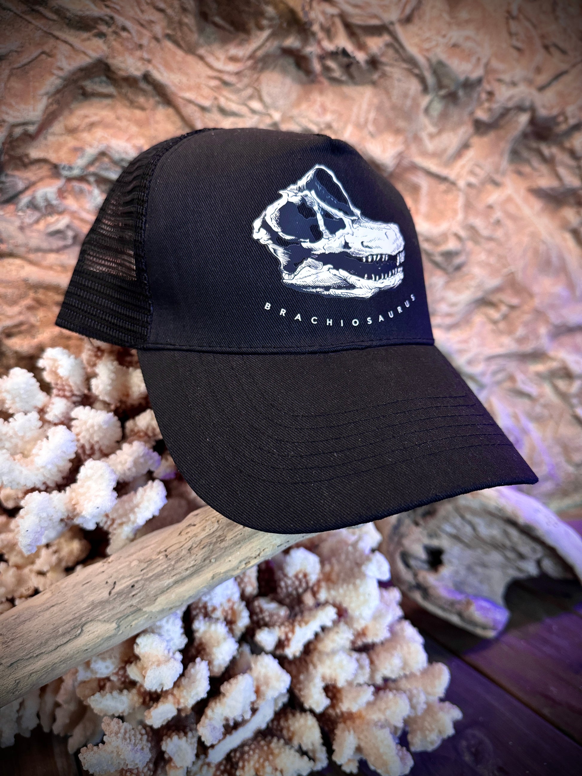 Graphic illustration of a Brachiosaurus skull by Aaron John Gregory, beautifully printed on an Otto brand all black, trucker snap-back cap.