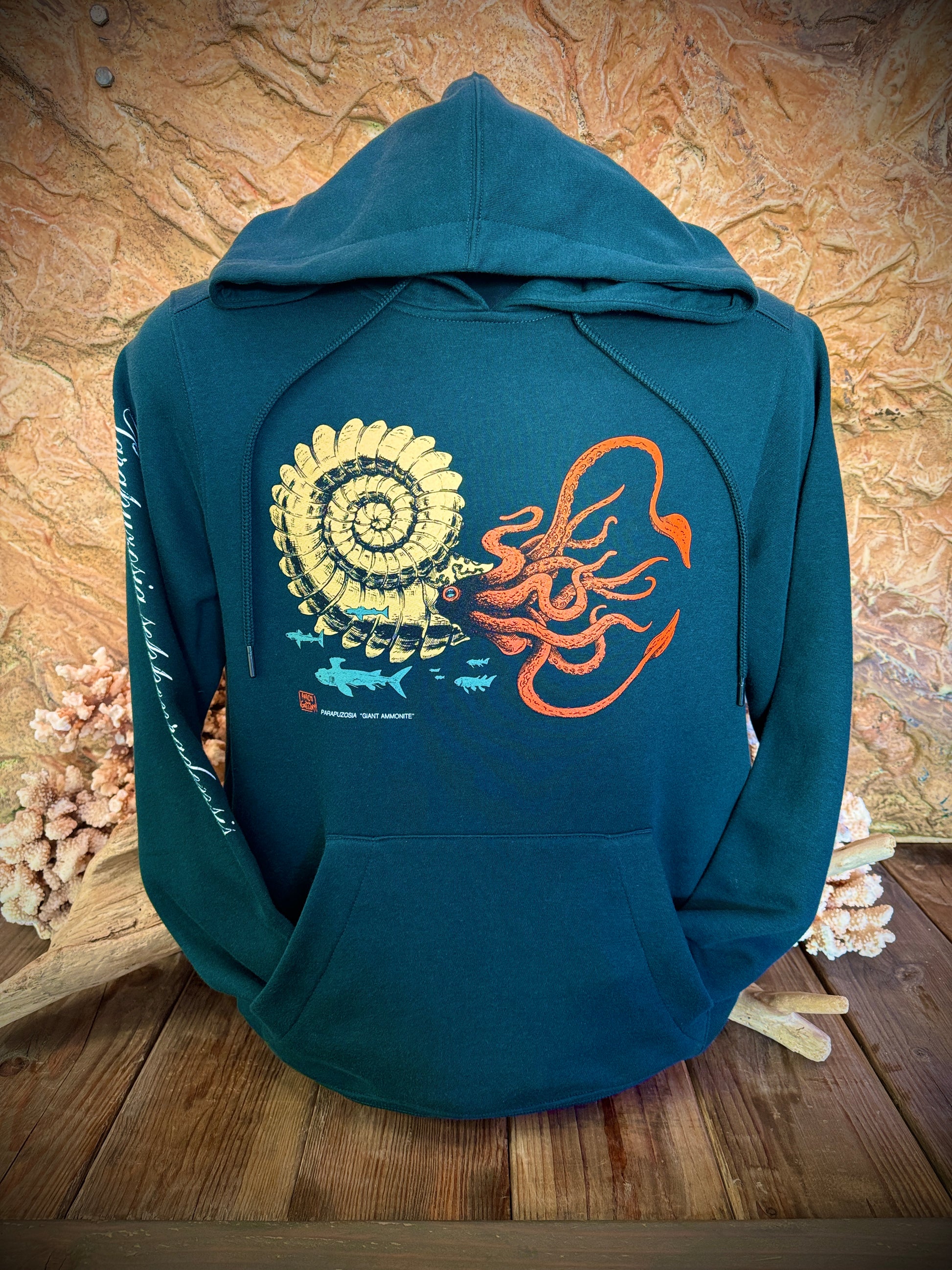 The Giant Ammonite (Parapuzosia seppenradensis) is back on a pull-over hoodie and a beautiful new colorway.