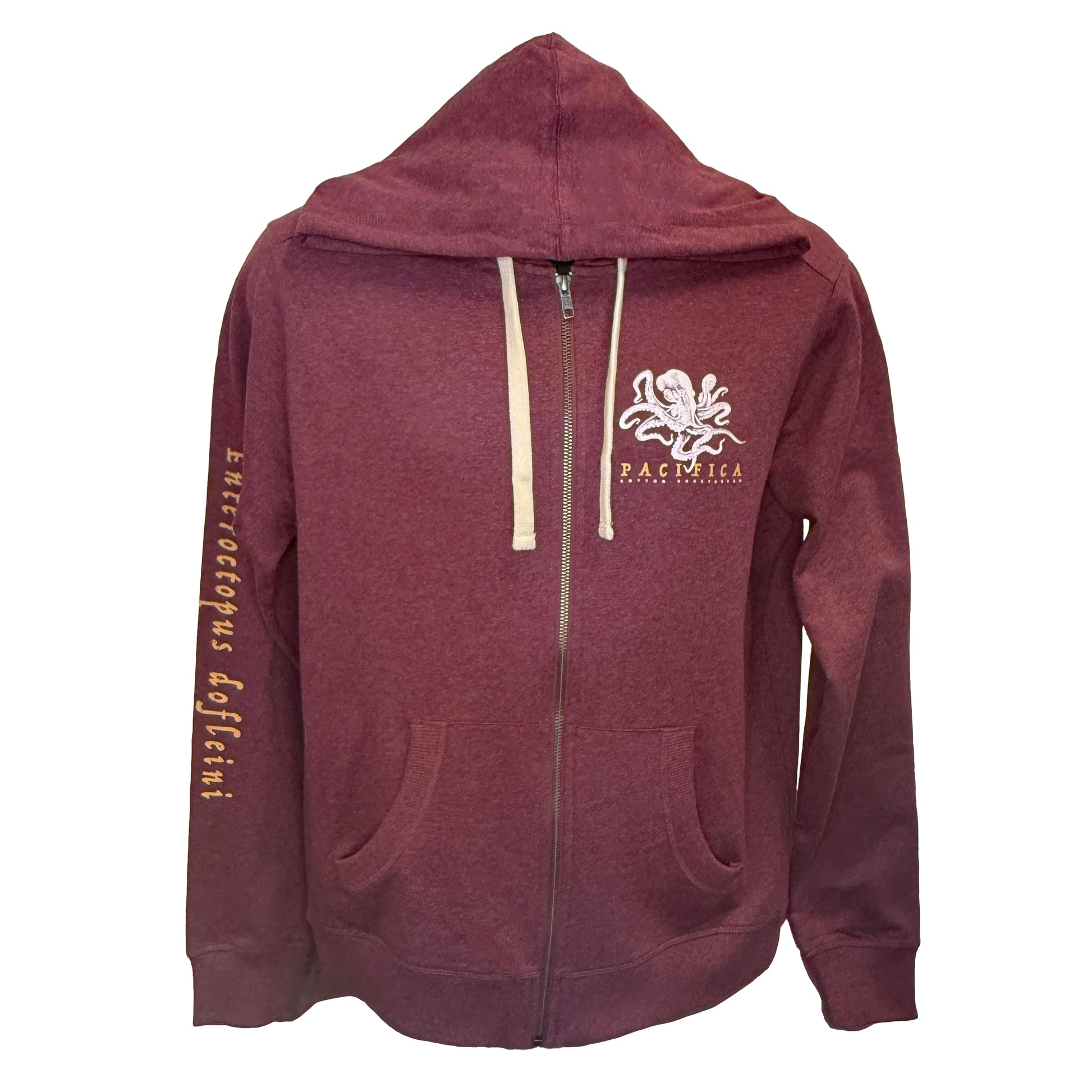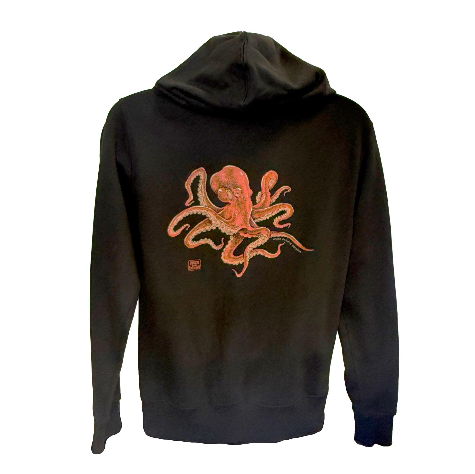 Our super popular Giant Pacific Octopus design, beautifully screen printed on either 100% cotton black zip-up with black zipper, or a poly-blend, wine-red heather, medium weight, zip-up hoodie; both from District Clothing.
