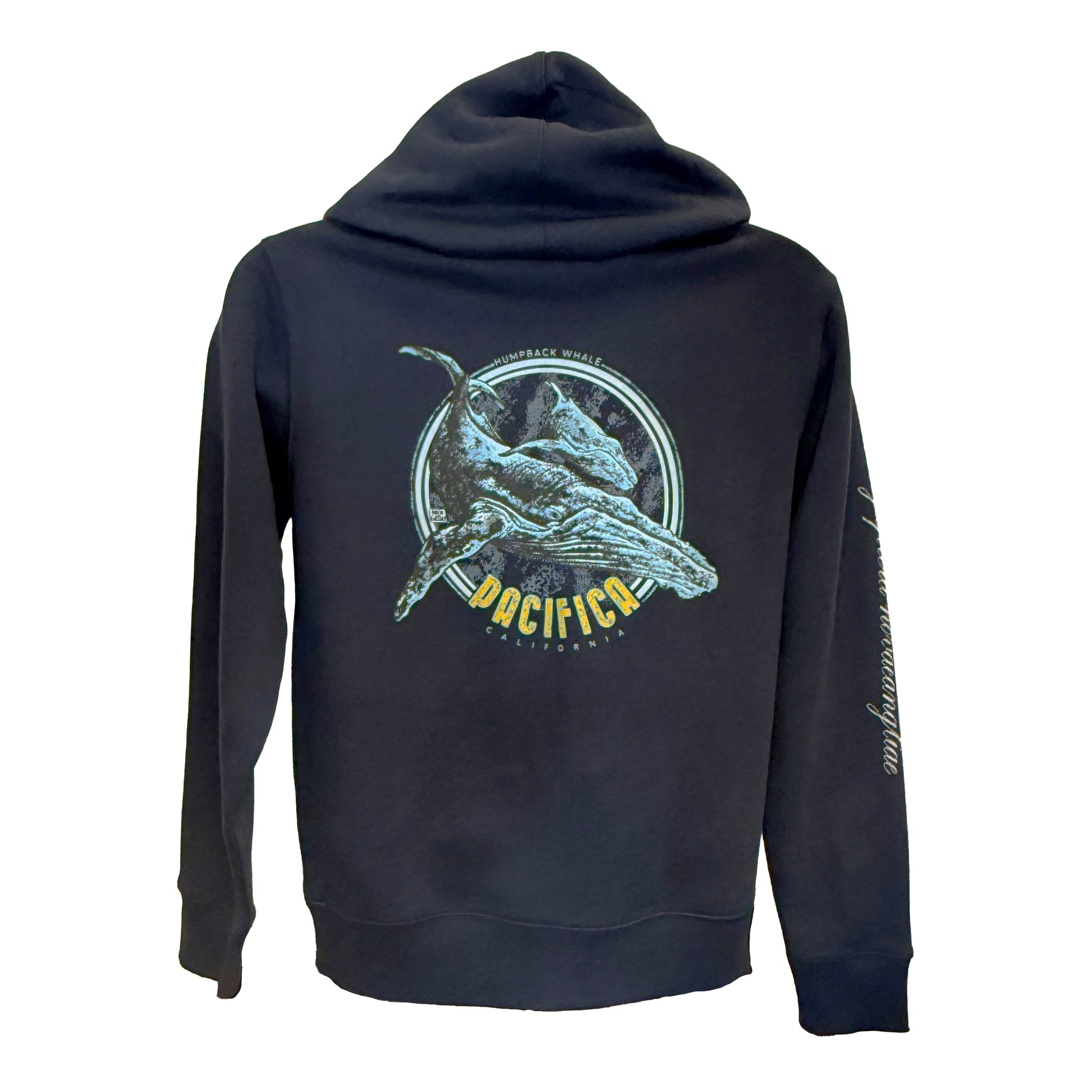 Humpback Whale and her calf, beautifully screen printed on either 100% cotton navy blue or a poly-blend dark turquoise heather, medium weight, zip-up hoodie from District Clothing.