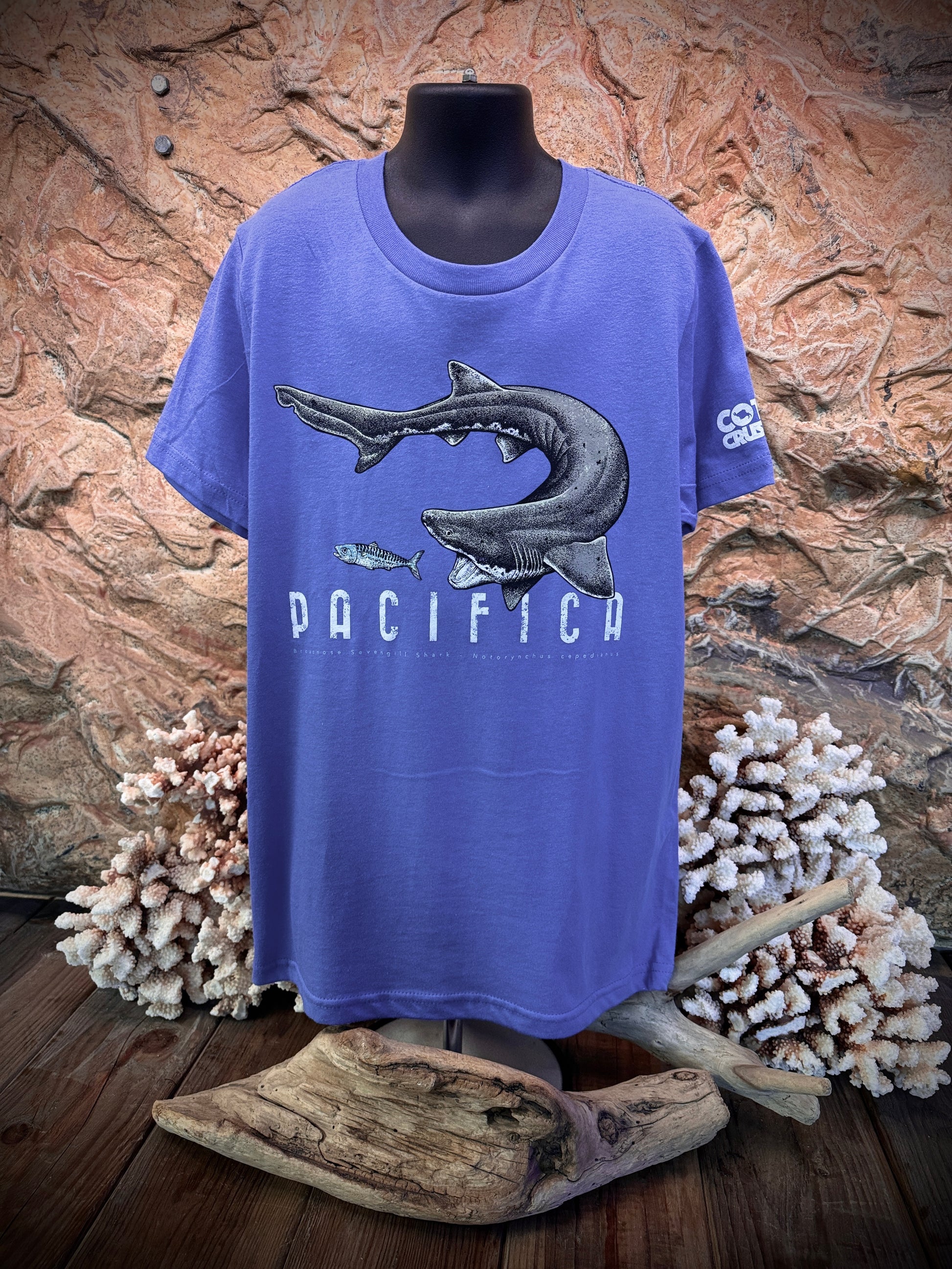 The return of our classic Broadnose Sevengill Shark shirt, but now with some undeniable PACIFICA pride! And also for the first time... on a YOUTH SHIRT!!