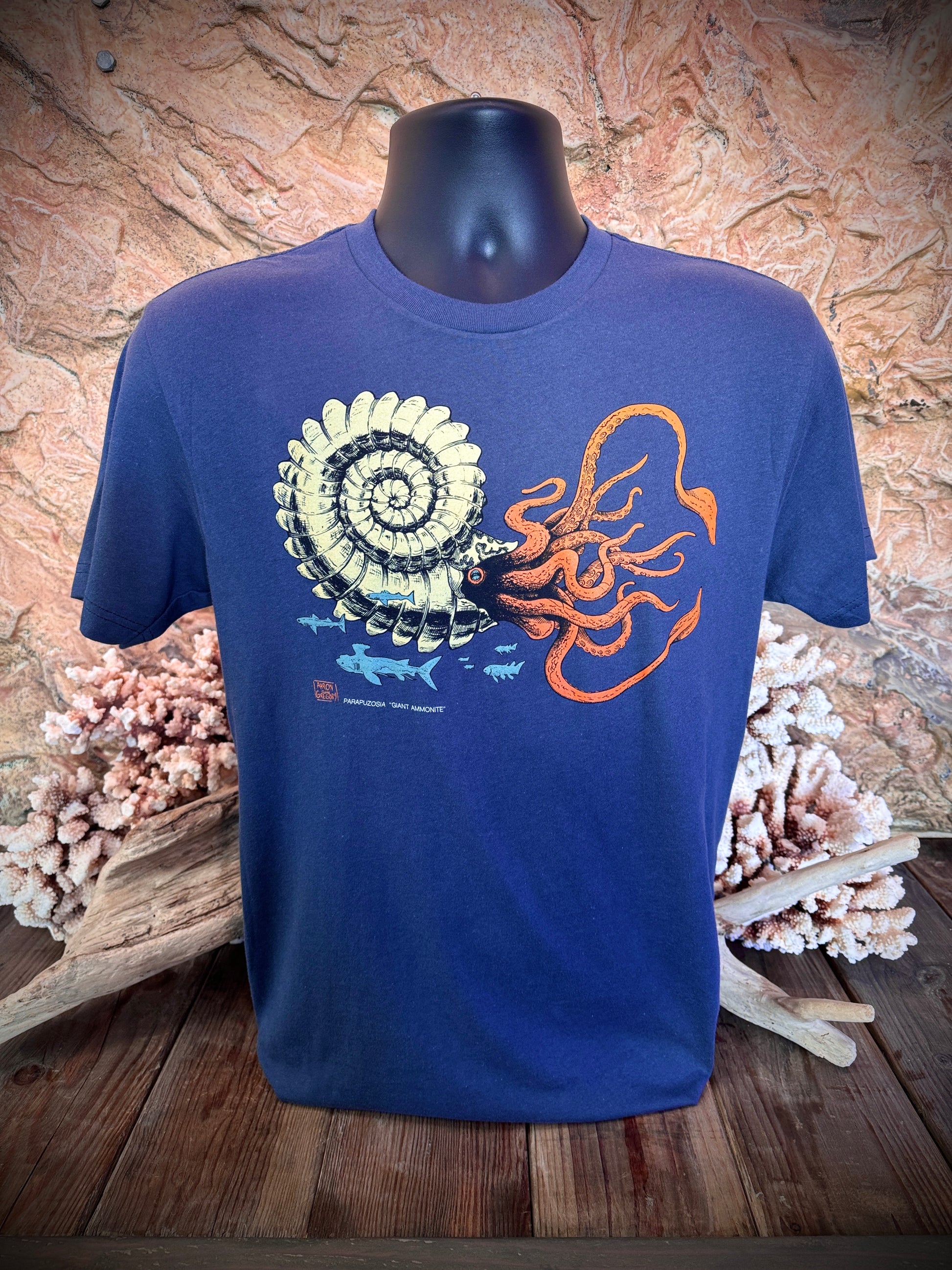 Giant. Ammonite beautifully screen printed on vintage navy, 100% combed cotton, unisex t-shirt.