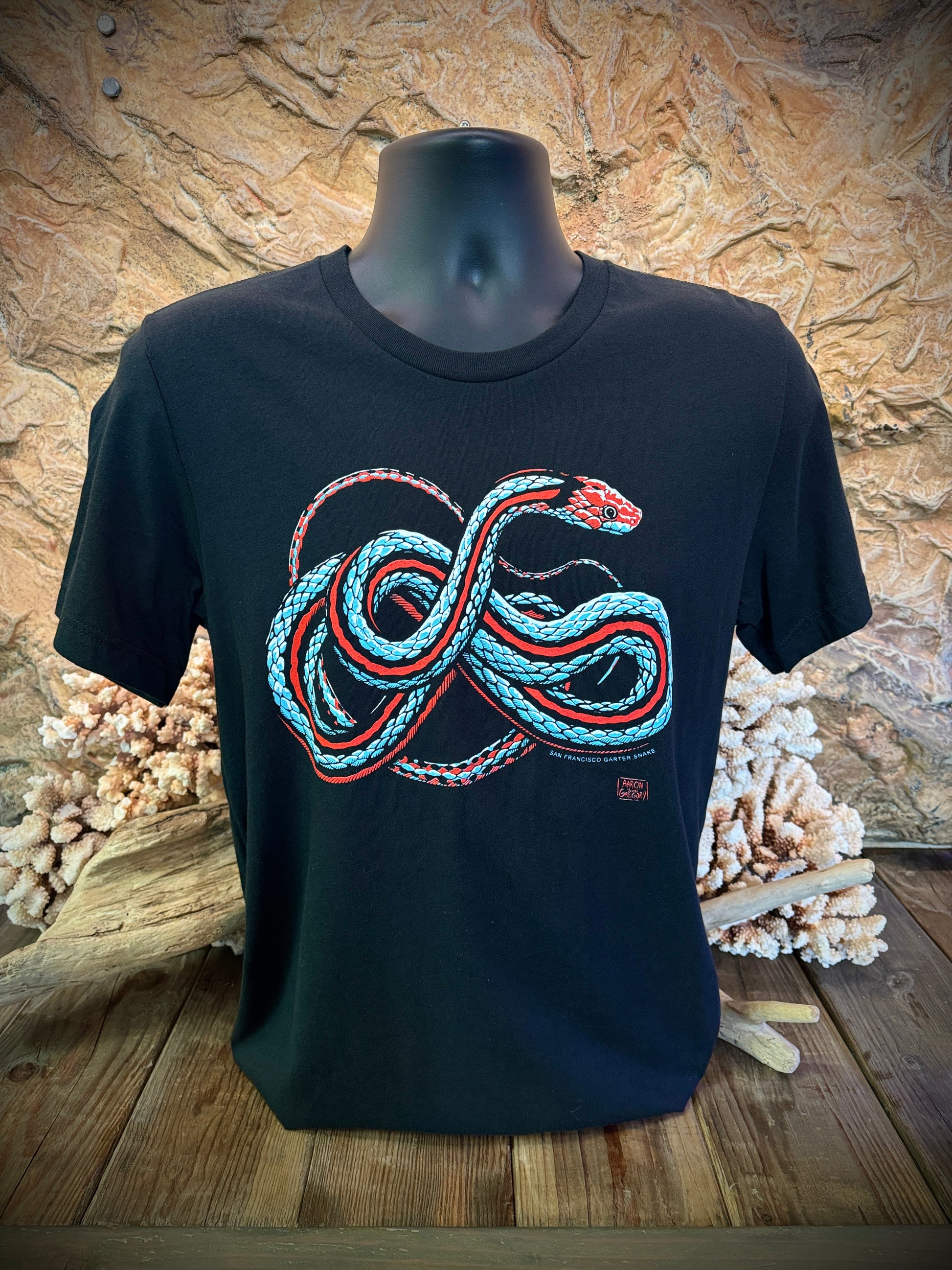 San Francisco Garter Snake beautifully screen printed on black, 100% combed cotton, unisex t-shirt.