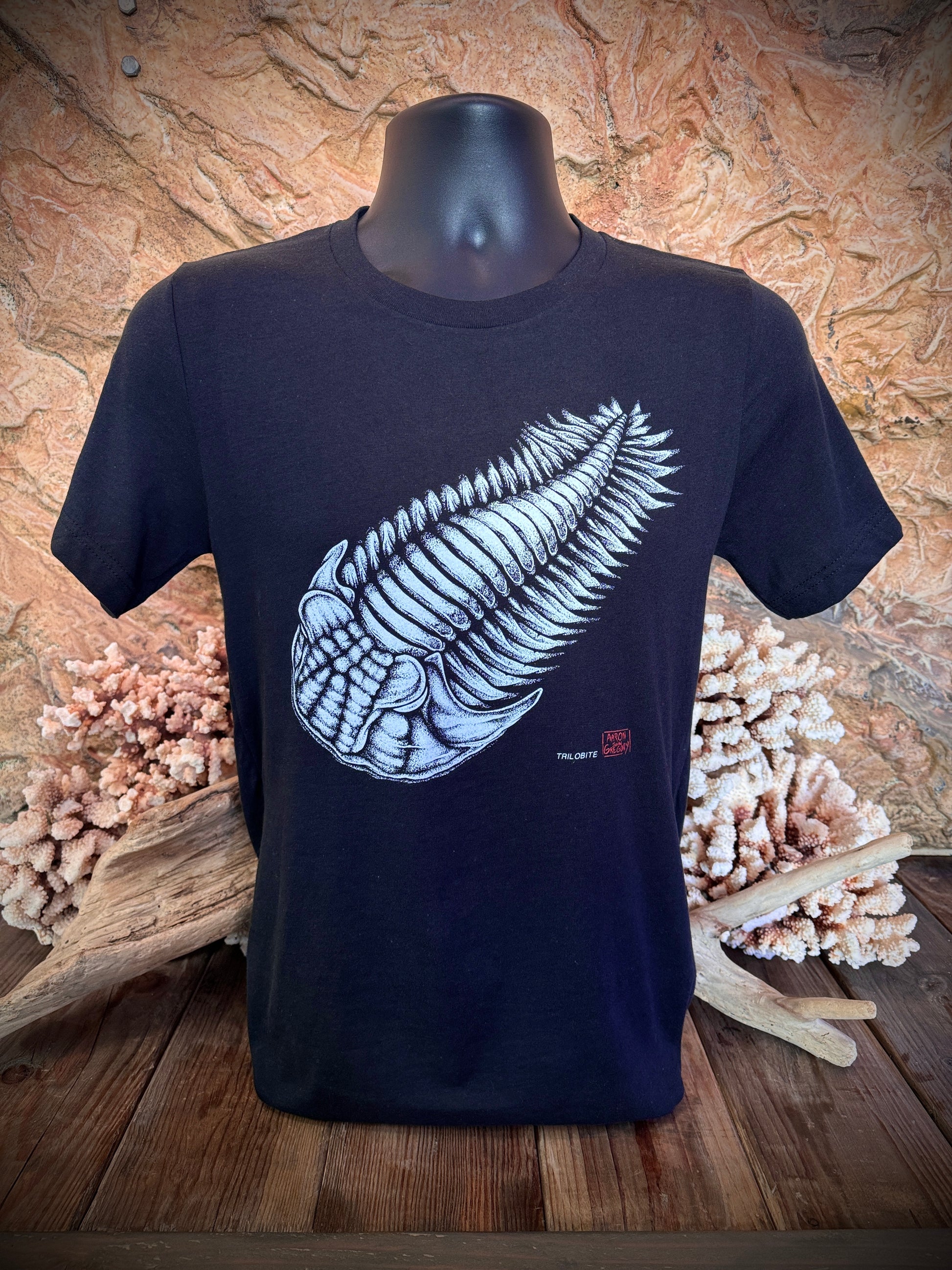 Trilobite beautifully screen printed on black, 100% combed cotton, unisex t-shirt.